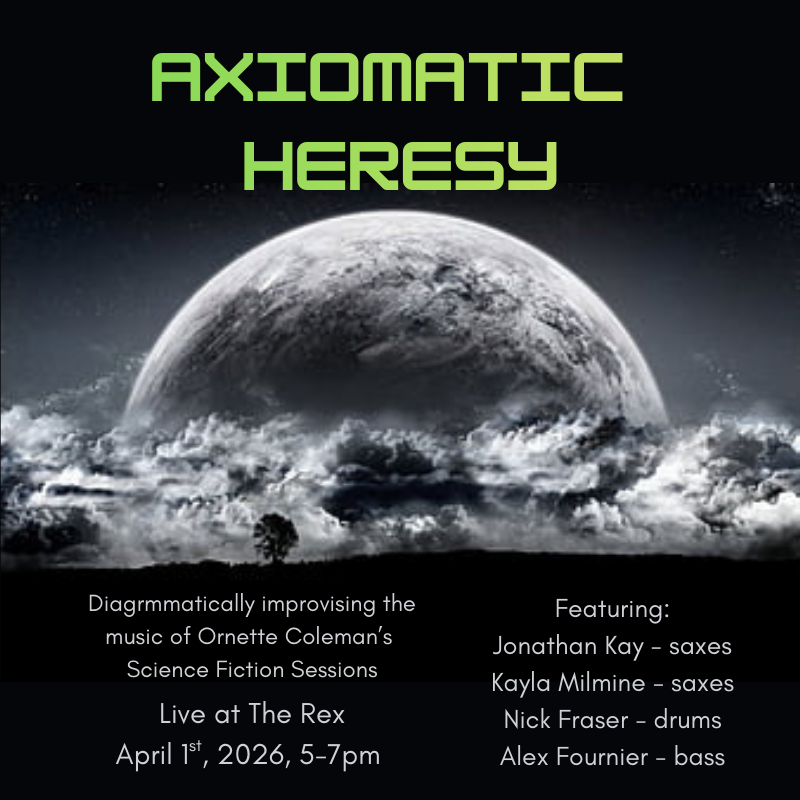 Axiomatic Heresy is a cordless trio led by saxophonist Jonathan Kay, rooted in a diagrammatic approach to reworking traditional materials through free (jazz) improvisation. Drawing on the spiritual and avant-garde lineages of Albert Ayler, Don Cherry, John/Alice Coltrane, Pharaoh Sanders, Jimmy Lyons, Julius Hemphill and Ornette Coleman, the project treats these repertoires as living frameworks for collective exploration rather than fixed texts. The core quartet features Jonathan Kay (saxophones), Nick Fraser (drums), and Alex Fournier (bass), with rotating guest saxophonists including Kayla Milmine, Andrew Kay, and Reagan Mitchell, creating an open, volatile sound-world where structure and rupture continually reconfigure one another.